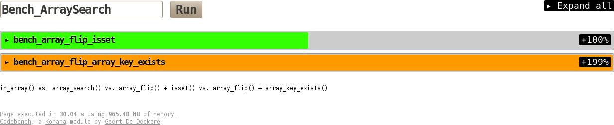public function bench_in_array($needle) { return in_array($needle, $this->haystack); } public function bench_array_search($needle) { if (array_search($needle, $this->haystack) === FALSE) return FALSE; return TRUE; } |