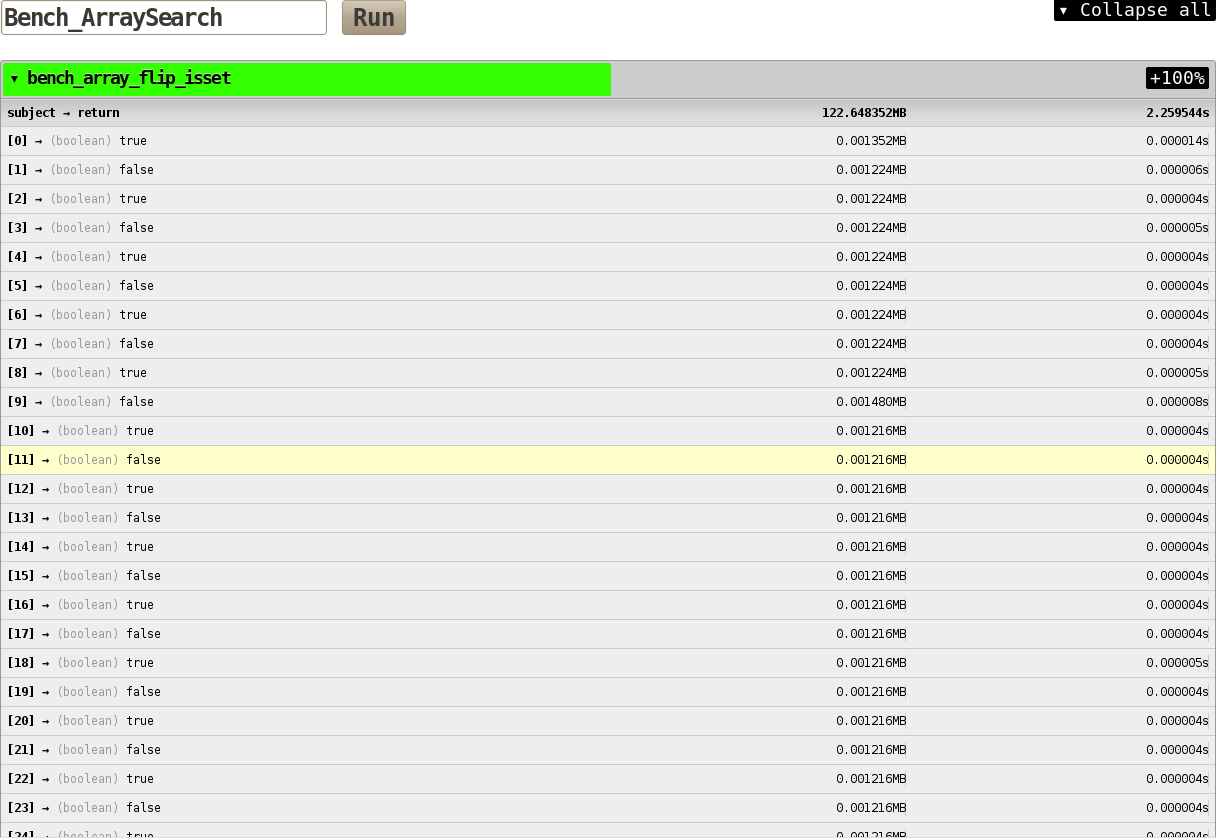 Pentru o listă de $needle scurtă (1% din $haystack, valori 100% valide), sunt aproximativ echivalente. Pentru un input 50% valid de dimensiunea $haystack, array_key_exists() este cu aproximativ 80% – 100% mai lent. Dar acum urmează partea frumoasă: căutarea se face indexat. Metoda este de cel puțin 2000 ori mai rapidă decât căutarea cu in_array() / array_search(). Adică în mod uzual căutarea de mai devreme de peste jumatate de oră durează aproximativ sub 3 secunde cu isset() și sub 5 secunde cu array_key_search(). Metodă testată pe un lookup table de 100.000 valori ce mi-a cam ucis browserul. Chrome a crăpat, Firefox a încărcat output-ul de la Codebench în vreo 3.5 GiB RAM. Atașez și imagini ce stau dovadă atrocității de mai devreme.
